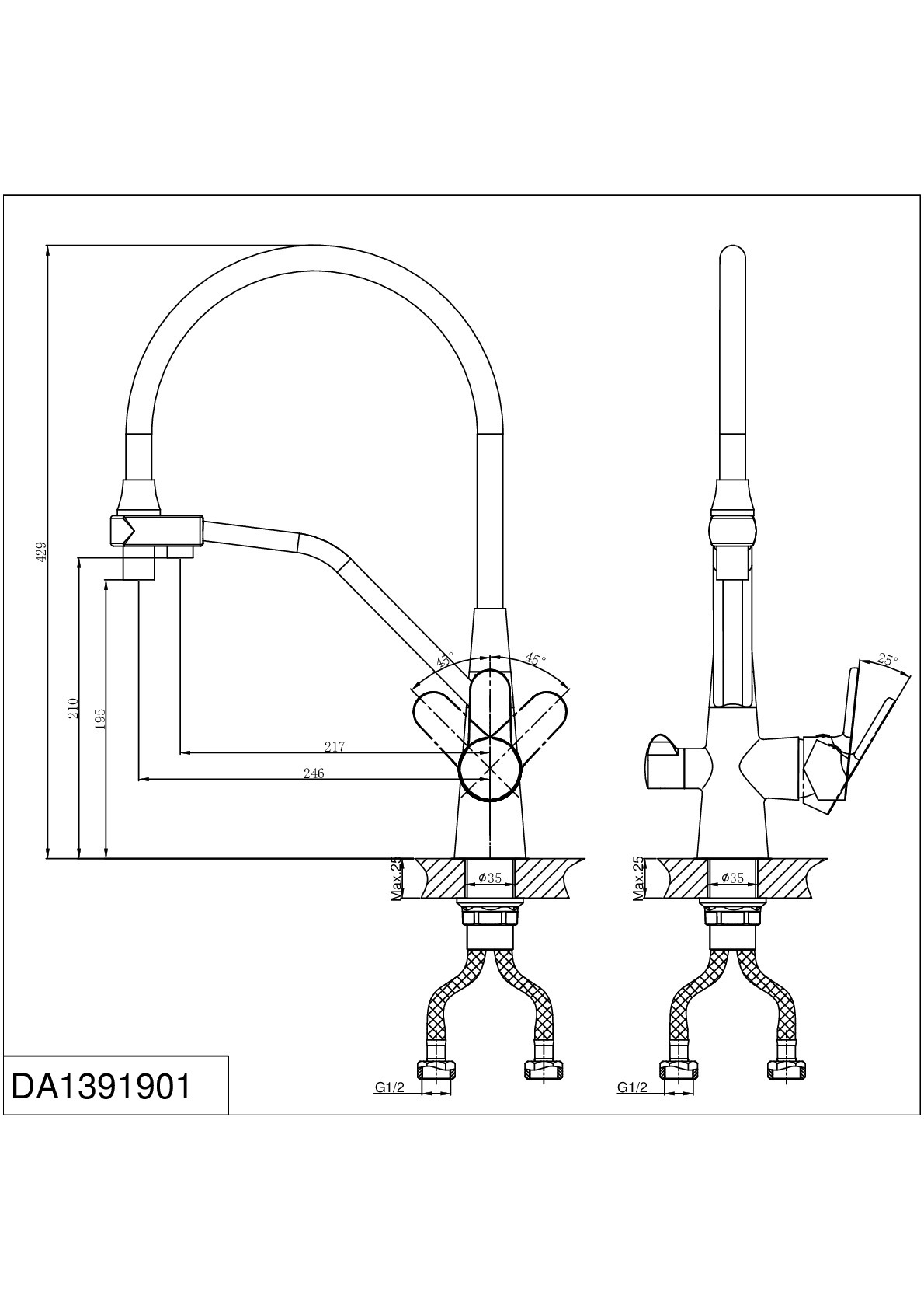 Смеситель для кухни D&K Rhein.Marx DA1391901 с подключением к фильтру гибкий излив хром Гарантия - 5 лет. Бесплатное сервисное обслуживание "D&K" - 10 лет.* Смесители немецкого бренда "D&K" производятся из латуни класса «А», что соответствует стандартам латуни HPB59-1, в РФ марка ЛЦ40С (ГОСТ 15527-2004) Толщина стенок смесителей «D&K» составляет 2,5 – 3,5 мм, Картридж D-35 мм. с высокопрочными пластинами из минерала Корунд (Al₂O₃) оксида алюминия. Низкий уровень шума: 17-19 дБ (сопоставим с шелестом листвы). Количество циклов открытия/закрытия - 500 000 Изделие тестируются под давлением воды и воздуха от 3 Атм до 10 Атм, на работоспособность комплектующих и качества сборки в соответствие стандартам. Высота до излива: 429 мм. Длина излива: 246 мм. Илив поворотный на 360° Гибкий излив с фиксацией на латунном изливе-штанге для водопроводной воды. Питьевая вода подаётся через излив-штангу Вода питьевая подаётся через отдельную трубку. Креплление: Гайка с фиксирующими винтами Гибкая подводка на 1/2" - 40см