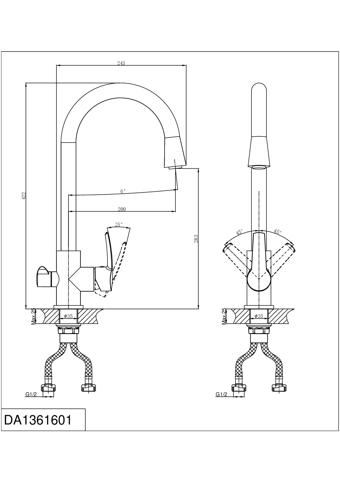 Смеситель для кухни D&K Rhein.Valerius DA1361601 с подключением к фильтру хром Гарантия - 5 лет. Бесплатное сервисное обслуживание "D&K" - 10 лет.* Смесители немецкого бренда "D&K" производятся из латуни класса «А», что соответствует стандартам латуни HPB59-1, в РФ марка ЛЦ40С (ГОСТ 15527-2004) Толщина стенок смесителей «D&K» составляет 2,5 – 3,5 мм, Картридж D-35 мм. с высокопрочными пластинами из минерала Корунд (Al₂O₃) оксида алюминия. Низкий уровень шума: 17-19 дБ (сопоставим с шелестом листвы). Количество циклов открытия/закрытия - 500 000 Изделие тестируются под давлением воды и воздуха от 3 Атм до 10 Атм, на работоспособность комплектующих и качества сборки в соответствие стандартам. Высота до излива: 422 мм. Длина излива: 243 мм. Илив поворотный на 360° Совмещённый пластиковый аэратор. Из централой части подаётся питьевая вода, через основую часть аэратора подаётся водопроводная вода. Вода питьевая подаётся через отдельную трубку. Креплление: Гайка с фиксирующими винтами Гибкая подводка на 1