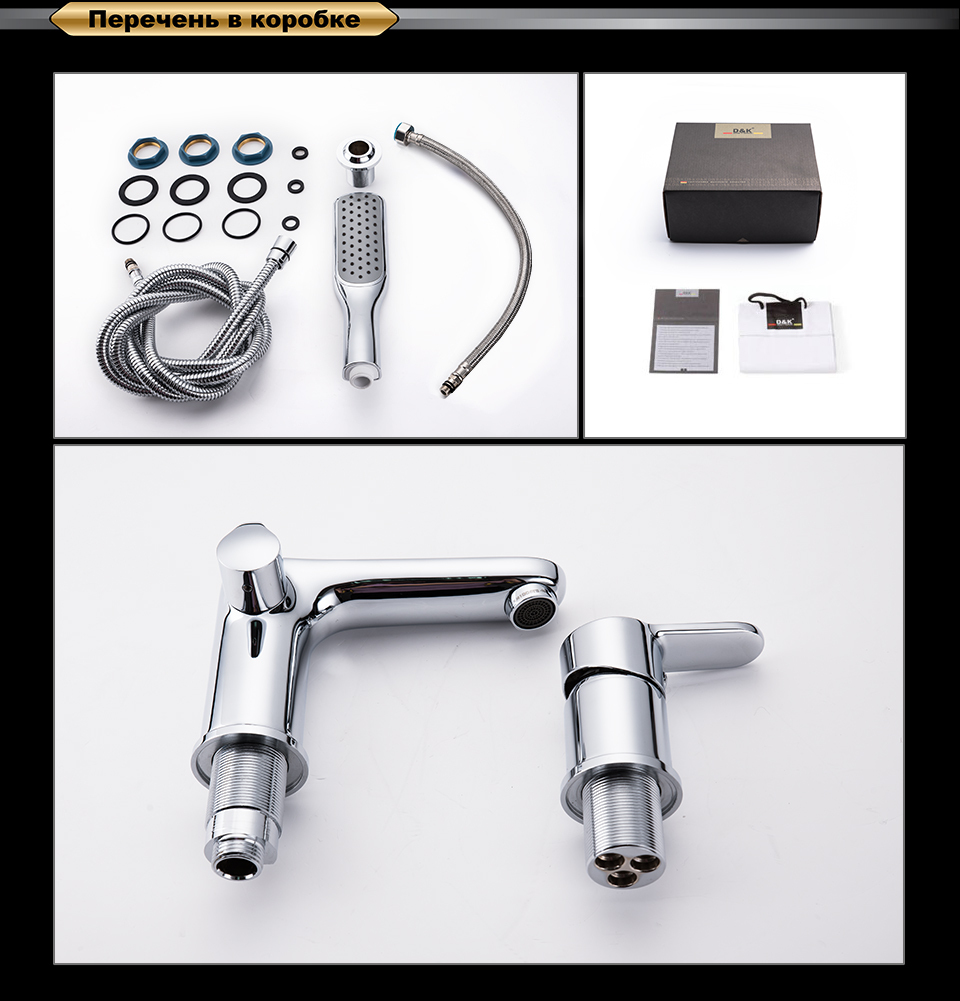 Смеситель, излив с дивертером (переключатель), крепёжная гайка-3шт, душевой шланг, соединительный шланг, душевая лейка, паспорт, брендовая сумка